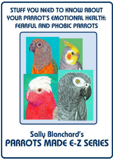Stuff You Need to Know About Your Parrot's Emotional Health: Including Helping Fearful and Phobic Parrots 25 pages .pdf Version (sent by e-mail) - $8.49 TOPICS INCLUDE: Important Concepts with Fearful and Phobic Parrots, Keeping your parrot emotionally healthy, Preventing Fearful and Phobic Behavior, The Results of Poor Early Socialization, Re-socializing a Fearful Parrot, Introducing New Situations to a Fearful Parrot, The Difference Between Fearful and Phobic Parrots, The Chair Exercise, the Neutral Room, Teaching Your Parrot Self-soothing Techniques, Social Security, Some Success Stories and more... |